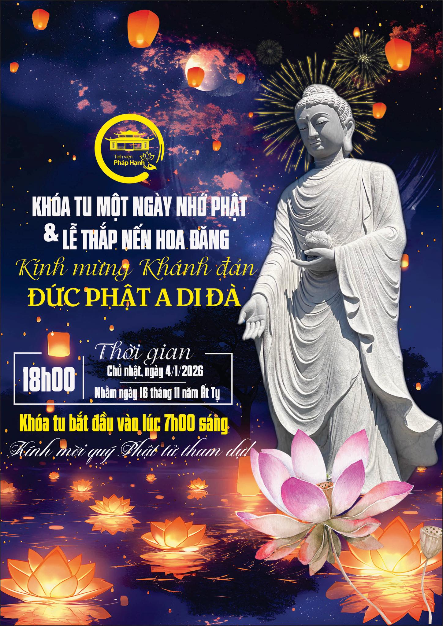Ngày Khánh đản Đức Phật A Di Đà đã về, Tịnh viện Pháp Hạnh trân trọng tổ chức Khóa tu “Một Ngày Nhớ Phật” kết hợp Lễ thắp nến hoa đăng nhằm gieo duyên lành tu tập, nuôi dưỡng chánh niệm và cùng nhau hướng tâm về cõi Tịnh độ an lành.