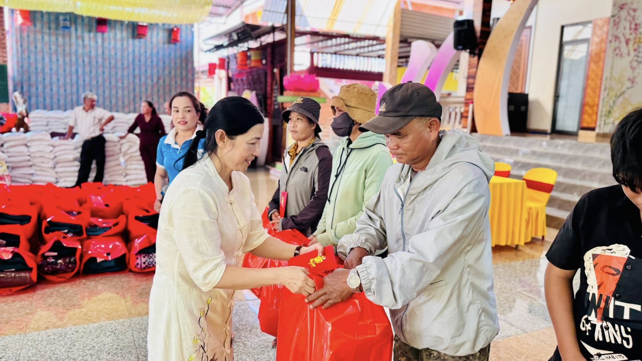 Mỗi phần quà gồm: áo ấm, mền, 10kg gạo, dầu ăn, gia vị… và phong bao lì xì 200.000đ. Phần quà tuy giản dị nhưng chứa đựng tấm lòng của người con Phật trao tặng - mong bà con đón một cái Tết bình an và sum vầy.
