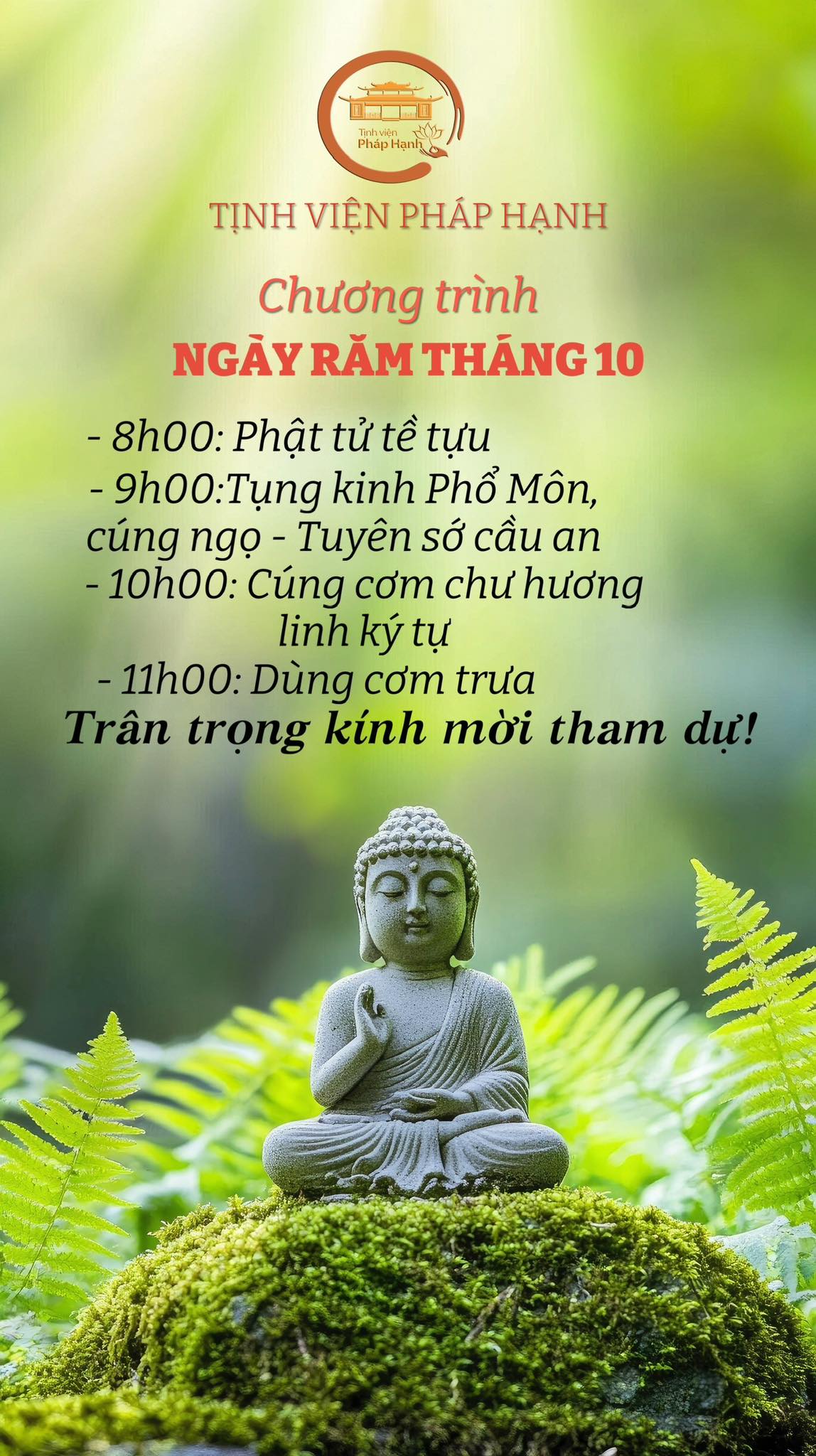 Tịnh viện Pháp Hạnh trân trọng kính mời quý Phật tử về tham dự khoá lễ ngày Rằm tháng 10 âm lịch – Tết Hạ Nguyên, cầu nguyện quốc thái dân an – gia đạo bình an – thân tâm an tịnh, vun bồi phước báu cho tự thân và gia đình.